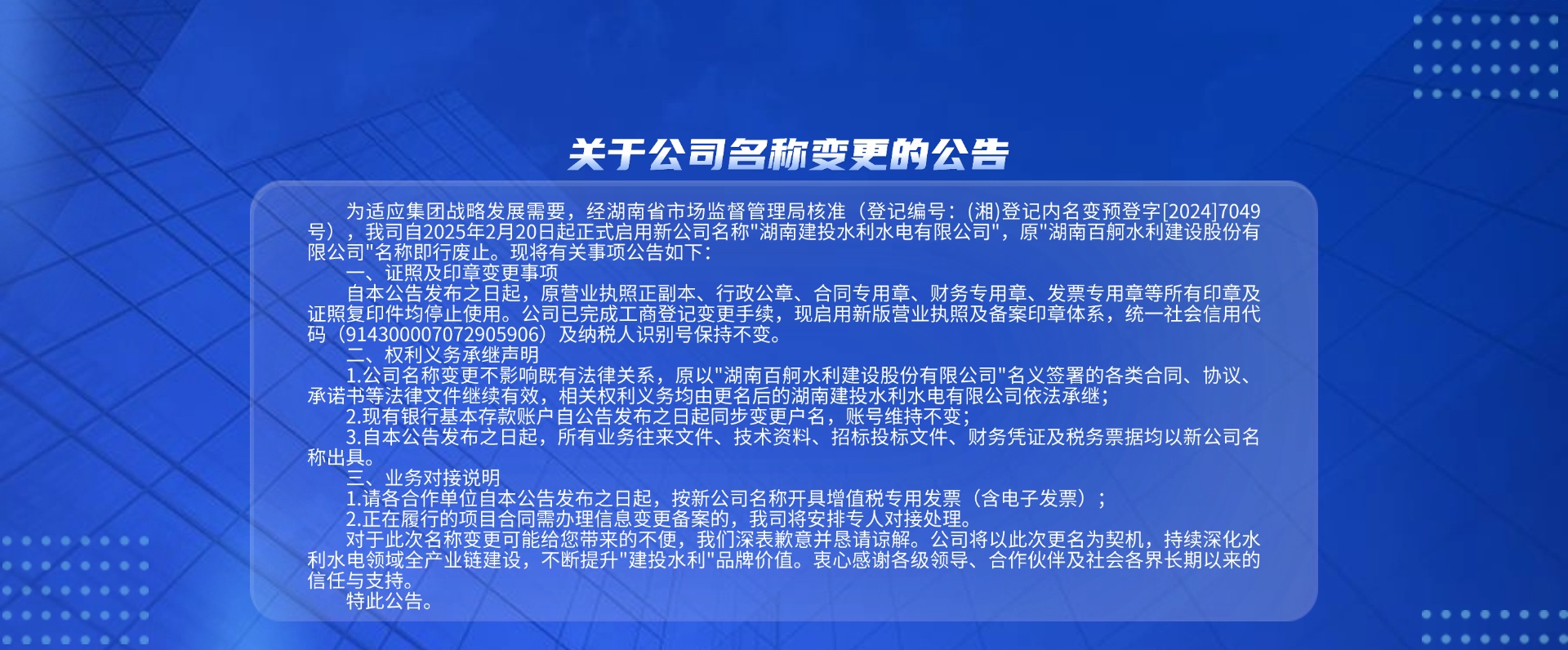 2022年9月,原湖南建工集團與原湖南交水建集團合并組建湖南建設投資集團。原雙方集團旗下的湖南百舸水利建設股份有限公司和湖南建工集團水利水電工程公司合并為湖南建投百舸水利公司,實行兩塊牌子(百舸水利、建工水利)管理,為湖南建投集團唯一水利建設企業。2024年9月,公司正式更名為湖南建投水利水電有限公司(簡稱湖南建投水利),統籌管理“百舸水利”“建工水利”“施工公司”“疏浚公司”等子品牌。